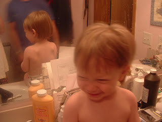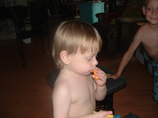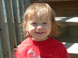 Okay, so he was beginning to look a little shaggy. I loved his long hair, but it was time for him to look like a little boy, and the girls needed to be discouraged from putting a ponytail in his hair. Also, it is 90 degrees out, so he really needed his hair off his neck. So we swallowed real hard. I held Elisha’s head and Doug went snip, snip.