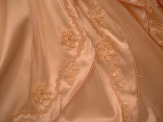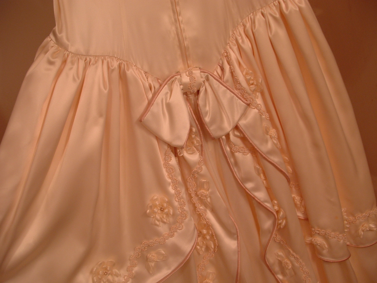 Yes, the wedding dress is mine. My mother designed and sewed it from a drawing I made. I made all the ribbon flowers. The funny part is that we were so worried that the neckline was modest enough. It ended up too high and the train pulled on it, so I felt like I was choking the whole day, but I was modest! Doug really appreciated that.