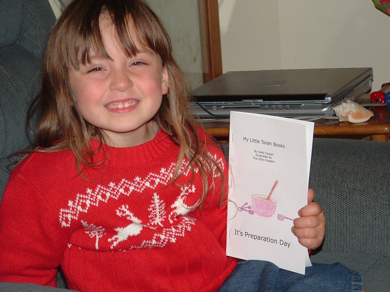 I would like to introduce my latest project. It’s a series of printable books that you can make up and use as another way to teach Torah to your little ones. Little kids will enjoy having mommy or daddy read it to them, and beginning readers will enjoy reading a book all by themselves. This first book is all about preparation day. I hope you enjoy it! We gave ours to our cousins, so we need to print a new one lol!