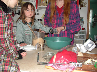 We made cookies. We counted the scoops of flour, practiced reading the recipe, and figured out how many 1/2 cups we needed to get two cups of sugar. Sadie worked on her counting, Isaac and Holly got some practice with addition, and Naomi worked some with fractions. Yes, I still have a head, by the way.