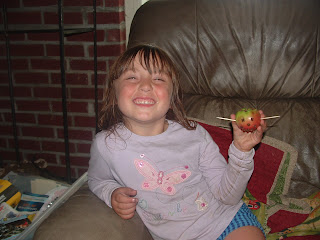 I had a little impromptu beginning today and was very pleased with the results. I found a book of one page stories with little activities. We read the first story, titled, “The Apple Man.” I pulled her up in my lap and began to read. You should have seen her face! She had a huge grin and just came alive while we were reading. Why don’t I read out loud more often? I don’t know. I guess I just get selfish and busy.
