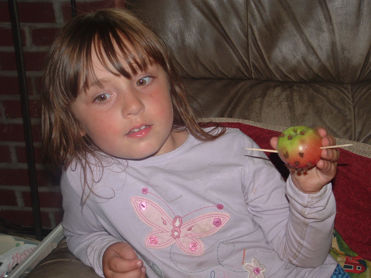 Well, when we were done, the book had a few suggested activities. We sang the song together, and made our own apple man. She picked an apple from one of our trees, and we made a face with cloves and arms out of toothpicks. We even cut an apple open to see the star. The older kiddos had to make their own apple men, too.