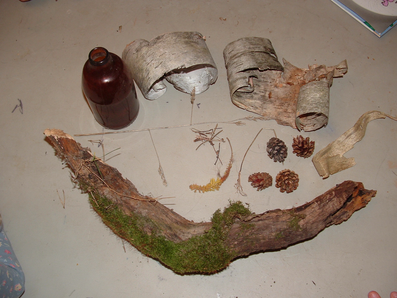 An old bottle, a wayward corn husk, and the always essential pinecones made their way into our collection.